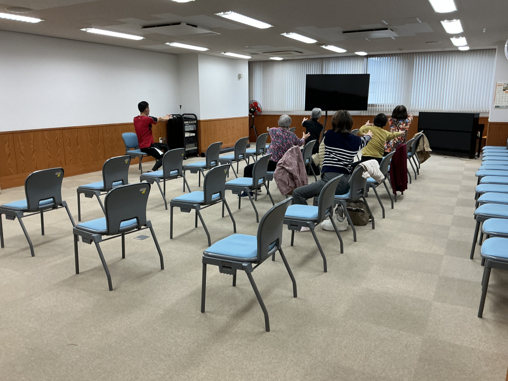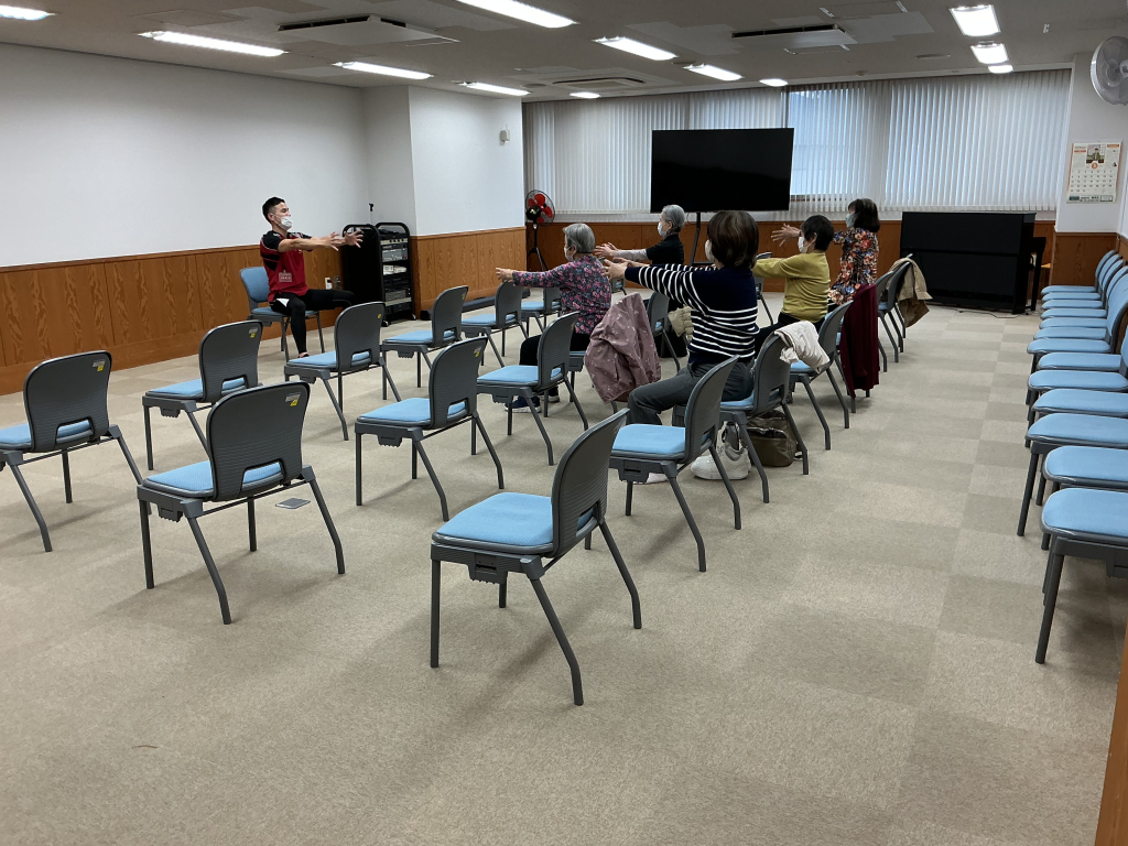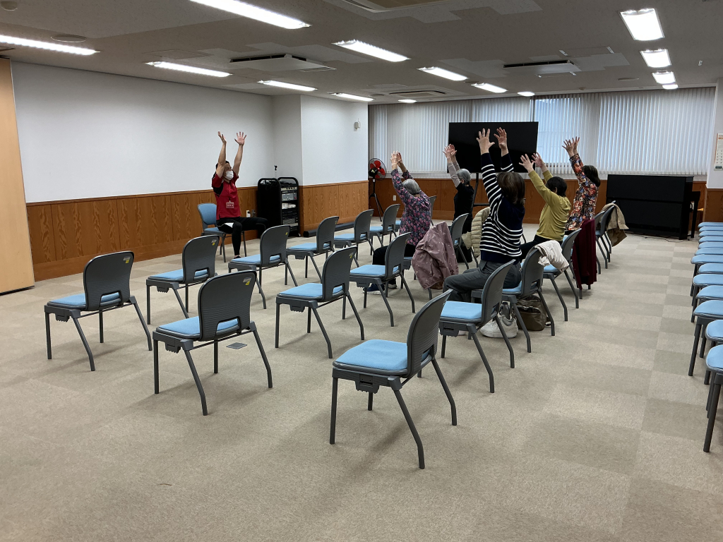 肩の痛みの軽減につながるとして、ボールを持っているイメージで、腕を伸ばして大きく動かす動きを行いました。