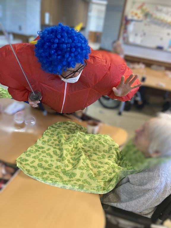 毎年恒例の「節分豆まき」を2月3日におこないました。赤鬼、青鬼が各フロアの食堂を練り歩くと「鬼は外、福は内!」とご利用者の大きな声が響き渡りました。おいしそうな豆を目の前に、つい、ご自分のお口の中に入れているご利用者も多かったです。